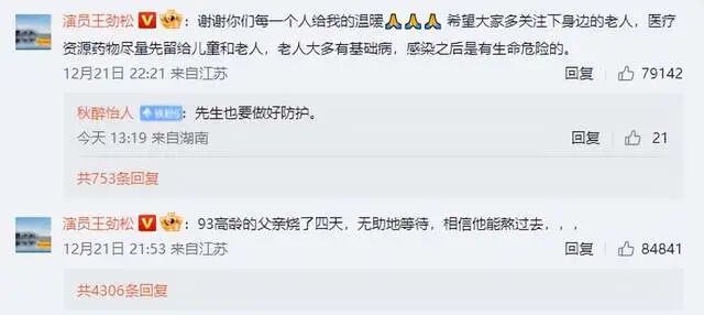 可让人万万没想到的是,王劲松在自己微博评论区里又发了一个非常不好的消息,说93岁高龄的老父亲已经烧了4天冷了,现在他只能无助等待,默默祈福老父亲能够熬过去,但目前生死状况不明,令很多人为之担心不已。