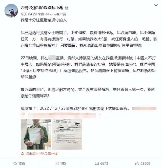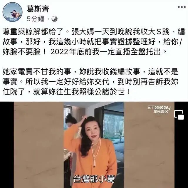 日前,台湾知名狗仔葛斯齐突然在微博上发文,表示已经给张兰足够的时间道歉,但对方却不知悔改,没有半点想要道歉的意思,所以只好向当地派出所报案,以被诽谤为由正式向张兰提告,目的就是为了自证清白,没有收过大S一分钱。