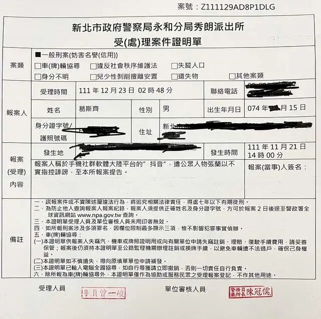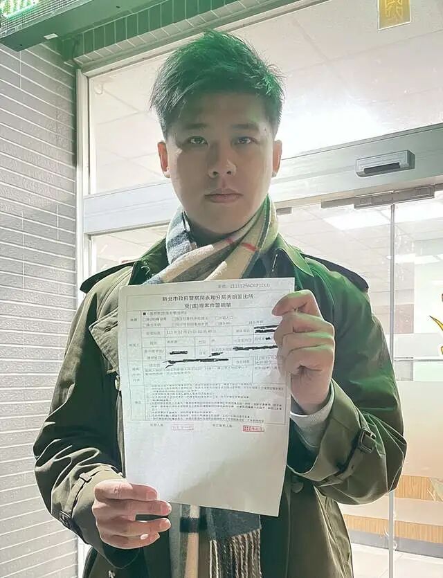 葛斯齐为了表明自己是动真格了,特意在派出所门口举着一张受理案件证明单,表情特别的严肃,不像是在开玩笑。