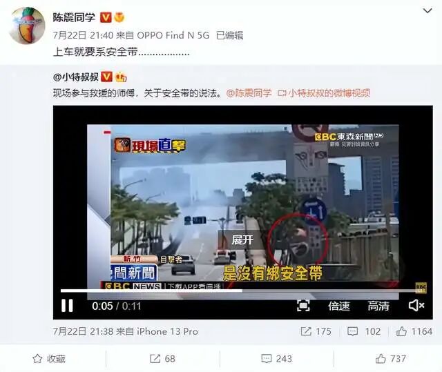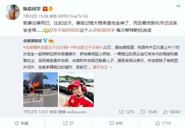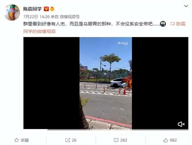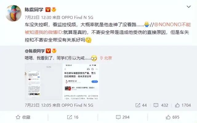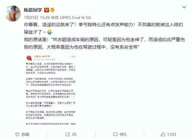 对此,陈震当时并没有把这些质疑和恶评当一回事,而是就事论事指出林志颖发生车祸,大概率是走神所致,而且看伤势似乎还没有安全带。由此不难看出,他只是在做保守的推测,并不敢百分之百肯定是人为事故。