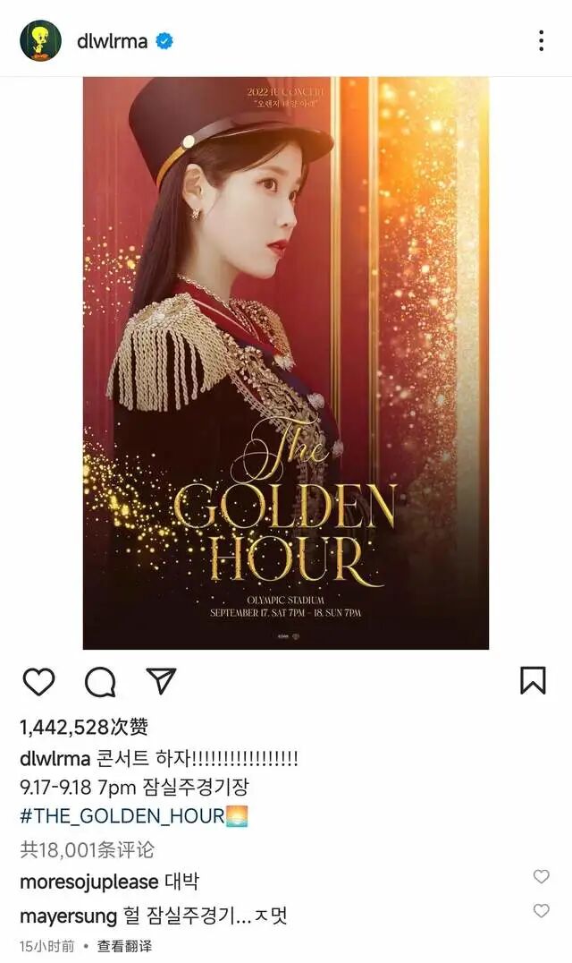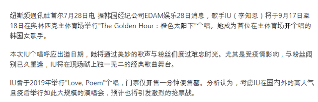 7月27日,韩国知名女歌手李知恩通过社交账号晒出了一张高清海报,并配文表示要开演唱会,同时还公布了演唱会的时间和地点,将在今年9月17日和18日两天,首尔奥林匹克主体育场举行两场,消息一出受到了歌迷们的热烈欢迎和支持。