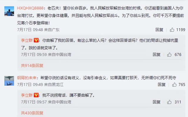 看到评论区全都是在谩骂指责,李立群感到十分委屈,挨个回复网友并解释称是大家曲解了他的回答,他的真实想法根本就不是那样的,还说是台媒在采访提问的时候故意给他挖坑跳,使得他的原话变味了。
