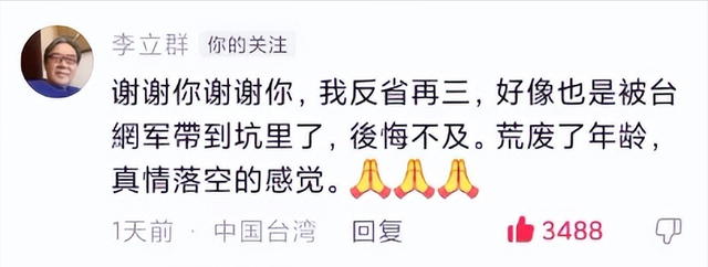 后来消失很长时间的李立群,突然出现在了网友声援他视频的评论区里头,留言感谢对方的支持和信任,同时表示自己正在认真反省,再次解释是被台媒的采访给带到了坑里,感到特别的后悔和自责。