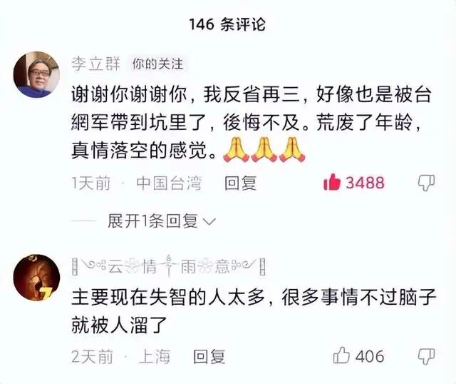 李立群后悔发表死守宝岛的言论,自称正在认真反省,但网暴却没停