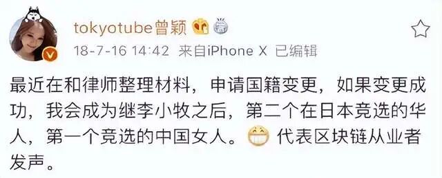除此之外,有人扒出曾颖很多年前在微博上发表过的一些“亲日言论”,其中有一条明确表明了要申请变更国籍,甚至还很骄傲地说要成为继李小牧之后,第二个在日本参加竞选的华人,第一个参加竞选的中国女人。