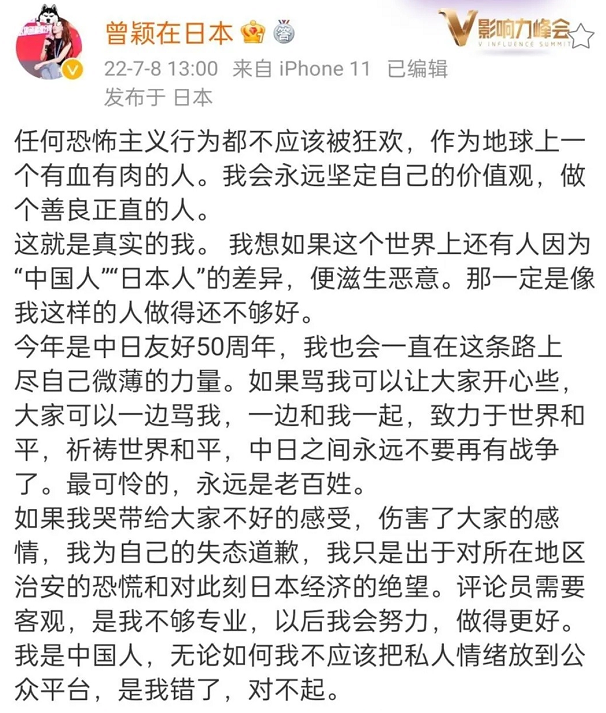 然而当时曾颖压根就没有意识到事情的严重性,觉得自己在直播过程中有些情绪化是没有任何问题的,因为她完全是站在人性的角度,以及对安倍晋三发自内心的崇拜和尊敬,所以才会展现出自己最真实的一面。