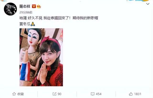 8月2日,亚洲舞王罗志祥通过微博晒出了一张男扮女装的照片,并配文表示好久不见,同时还向影迷们报平安,称自己已经从泰国返回到了宝岛,希望大家能够多多支持他的新歌,最后还学泰国人双手合十予以感谢。