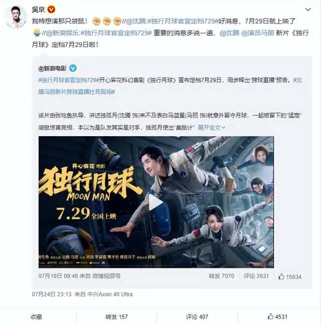 总而言之,《独行月球》是一部好电影,不是广告也不是拍马屁,而吴京乐开花的笑容就是最好的答案。