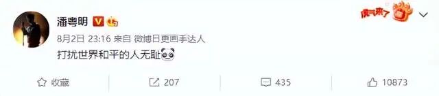 对此,潘粤明在第一时间通过在微博上发文称:“打扰世界和平的人无耻。”很明显就是在谴责佩洛西这样的卑鄙行为,完全是在破坏中美之间的关系。