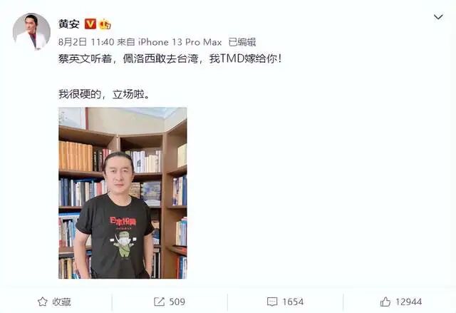 而就在佩洛西还未窜台之前,黄安身穿印有“日本投降”字样的短T,霸气喊话空心菜,说只要佩洛西敢去宝岛,他就嫁给她,最后还强调自己的立场很硬,不要挑战他的容忍底线。