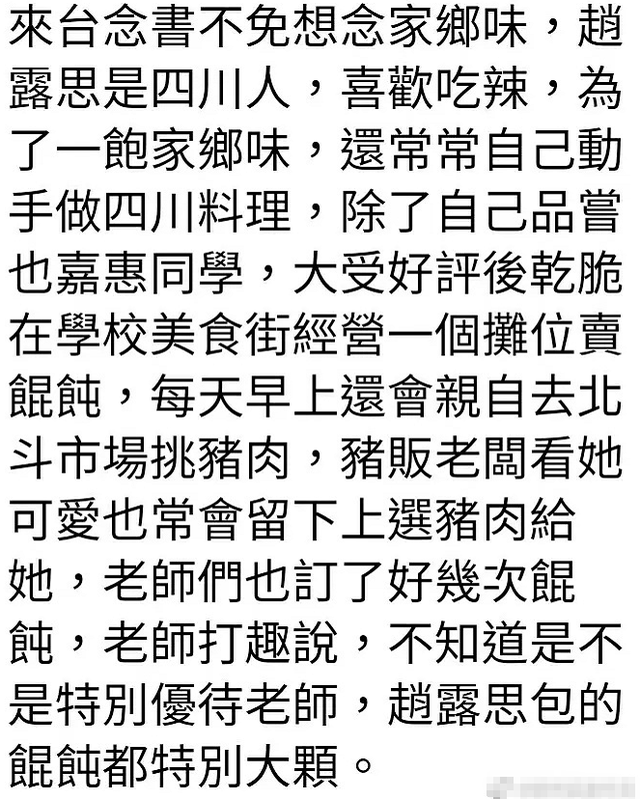其实关于赵露思在宝岛读大学的事,包括在大学美食街摆摊卖馄饨,台媒此前就有过多次的报道,只是当时赵露思知名度并不高,大家也就没有过度去关注。