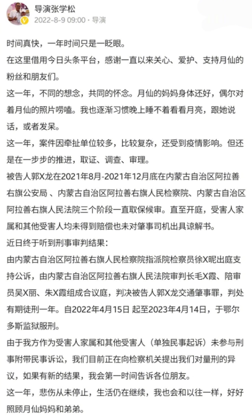 8月9日,知名导演张学松通过个人社交账号,发长文对外透露了亡妻于月仙车祸案最新进展情况,而这一天正好是于月仙逝世一周年纪念日,他表示从未中断过对于月仙的思念,同时还对车祸肇事者只判处有期徒刑一年感到不满,目前正在向检察机关对量刑提出异议。