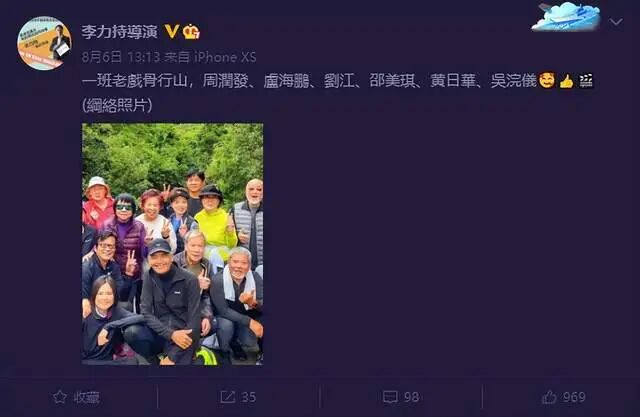 日前,知名导演李力持通过微博晒出了一群老戏骨相约爬山的合影照,其中影帝周润发站C位,单膝跪在地上面露出笑容,状态看上去相当不错。而他旁边还有很多大家熟悉的面孔,比如黄日华、刘江、邵美琪和卢海鹏,等等实力派老演员。