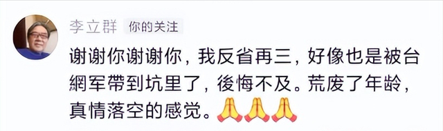 包括前不久,他在影迷发视频声援他的评论区底下留言,说自己好像被台媒给带到坑里了,感到特别的后悔,现在正在认真反省,觉得不该接受采访,更应该说那样子的话,不仅荒废了年龄,同时有一种真情落空的感觉。
