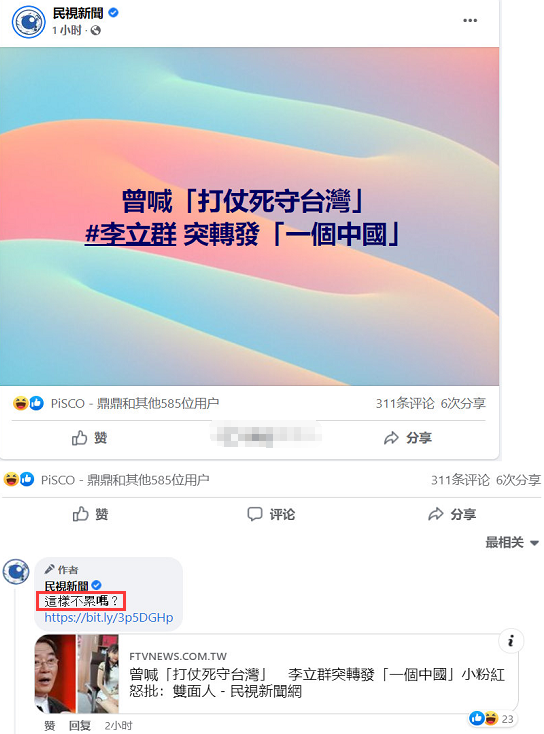 还有就是臭名远扬的民视新闻,也是借着报道新闻的幌子,对李立群明嘲暗讽,说他前面还高喊着打仗要死守宝岛,现在又突然转发一个中国,问他这样做难道不会累吗?