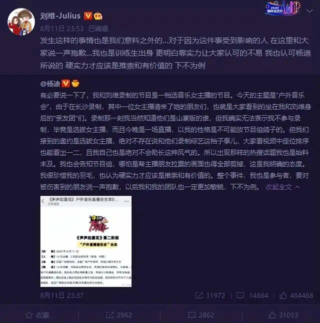 除此之外,刘维的心里头也挺不舒服的,看到杨迪发博后迅速转评表明了自己的想法,他觉得发生这样的事情已经完全超出了意料,认同杨迪说的话很对,同时也强调自己曾经也是训练生出身,更明白靠实力让大家认可的不易。