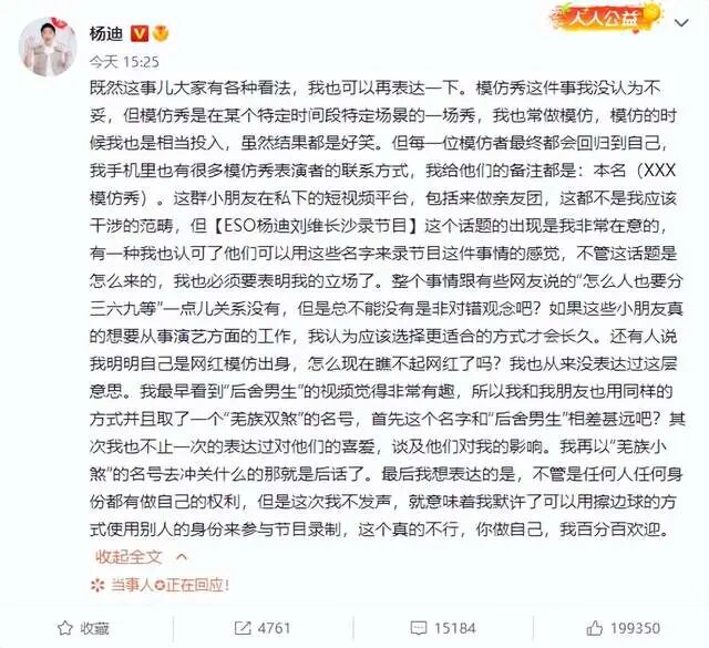 由此不难看出,杨迪对于山寨男团ESO是非常反感的,一方面是受到了舆论的负面影响,另一方面是打心里就觉得ESO来路不正,与其为伍显然是掉价的行为,所以才会接连两次发文回应此事。