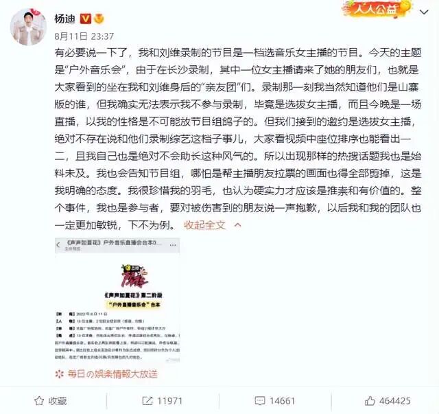 日前,知名主持人杨迪连发了两条微博,回应了与山寨男团ESO一起录节目的事,表示自己当时根本就不知道ESO会过来,再加上已经答应了节目组,所以只能无奈配合完成这项工作。但这并不代表他是在助长这种不良风气,同时他已经向节目组提出要求剪掉他帮主播朋友拉票的镜头。
