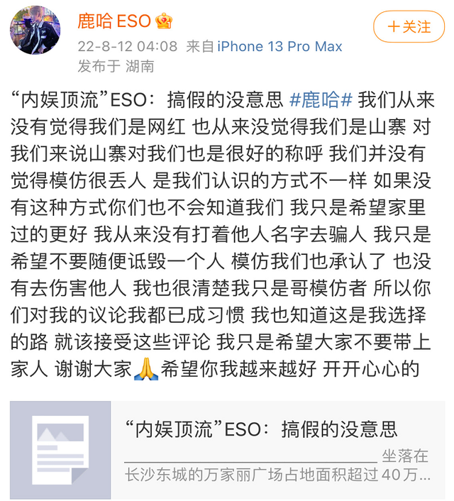 日前,山寨男团ESO的颜值担当鹿哈通过微博发文回应了外界的质疑,他声称自己不是网红也不是山寨,只是通过模仿的方式让大家认识他的,而这样做只是为了挣钱让家里人生活过得更好,并且强调自己从没有打着他人名字去骗钱,希望大家不要去诋毁污蔑他,更不要辱骂攻击他的家人。