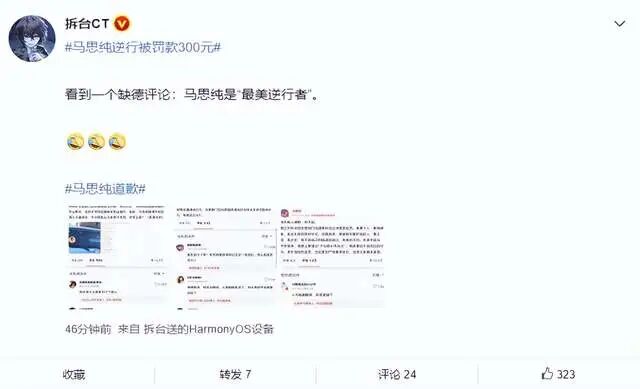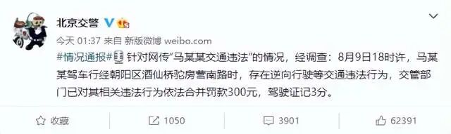 且不说狗仔偷拍是对还是错,但马思纯逆向行驶确确实实属于交通违法行为,这一点是没得跑的。而视频被曝光出来后,在全网引起了非常大的关注,同时也引起了北京交警的高度关注,紧接着北京交警就对外发布了情况通报,依法对马思纯罚款300元,驾驶证扣3分。