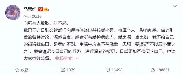 后来马思纯通过微博公开道歉,自称在没有通报之前,她已经到交管部门沟通事件经过并接受处罚,对此感到非常的自责,不该心存侥幸心理,做这种有损个人形象的事。同时还表示日后会更加严格要求自己,保证不会再犯这种错误,希望大家能够继续监督她。