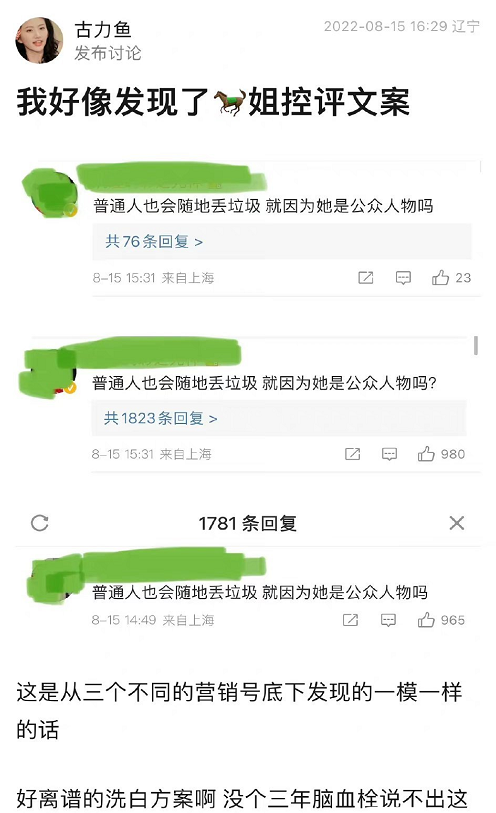 比如马思纯在没有发文道歉之前,与之相关的评论区画风是出奇的一致,全都是在指责公众玻璃心,刻意针对马思纯,觉得乱丢垃圾是很正常不过的事情,不能以她是明星就要搞区别对待,这显然是不公平的事。