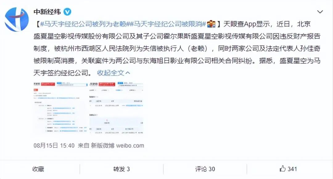 然而巧合的是,就在几天前马天宇经纪公司因违反财产报告制度,被法院列为老赖并且限制高消费。据悉执行案件是跟一家电影公司存在合同纠纷,但具体是什么原因闹掰的,恐怕马天宇是不太了解的,但这件事对他影响倒还是挺大的,至少当时还上了一个热搜。