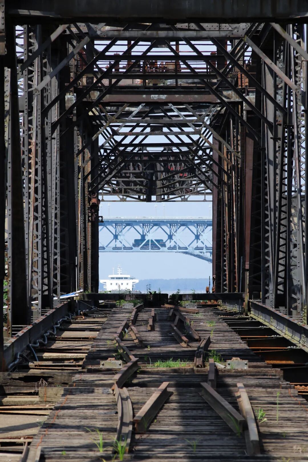 透过下关铁路轮渡栈桥旧址的引桥,就能看到下游2公里处的南京长江大桥。1973年,南京长江大桥通车5年后,这条铁路轮渡退出了历史舞台。(图片/Jerry歡/图虫创意)