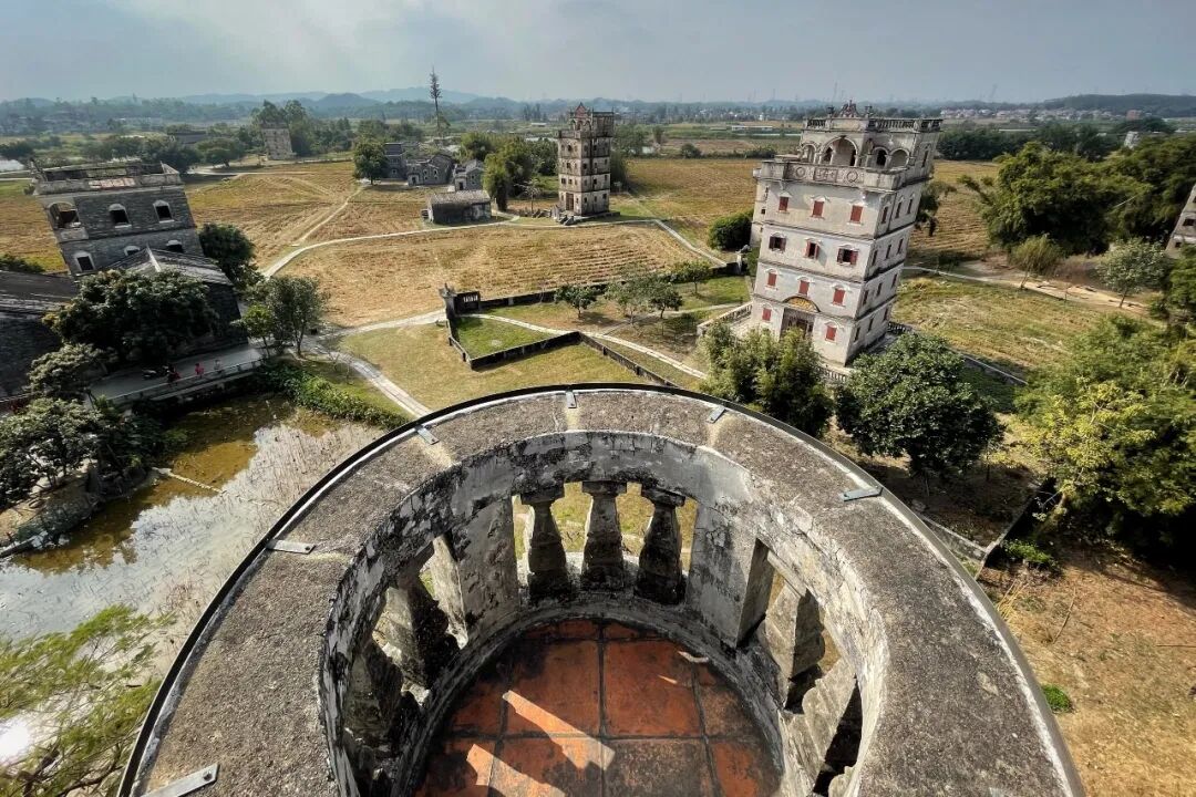 游览开平碉楼的最佳方式,可能是穿梭其间的乡村巴士,不用去围墙里的景区,某个树林掩映之处,总能闪现跳出地平线的高耸建筑,历经百年的风吹雨打,留下满身斑驳的痕迹,依旧与周遭的农业生活情境保持着距离。