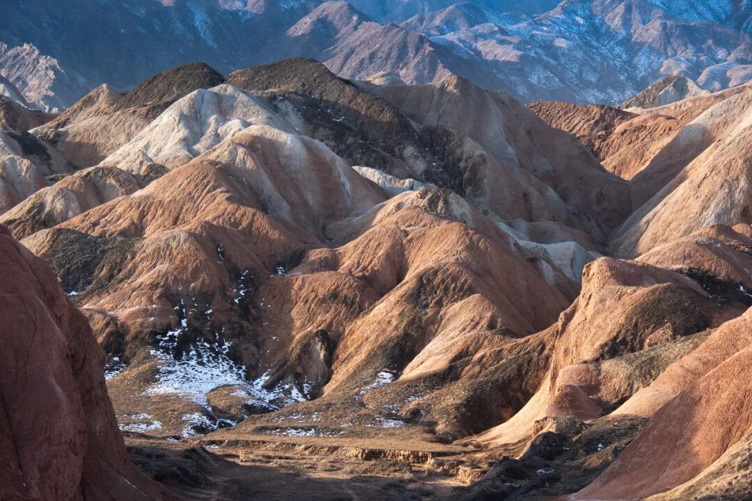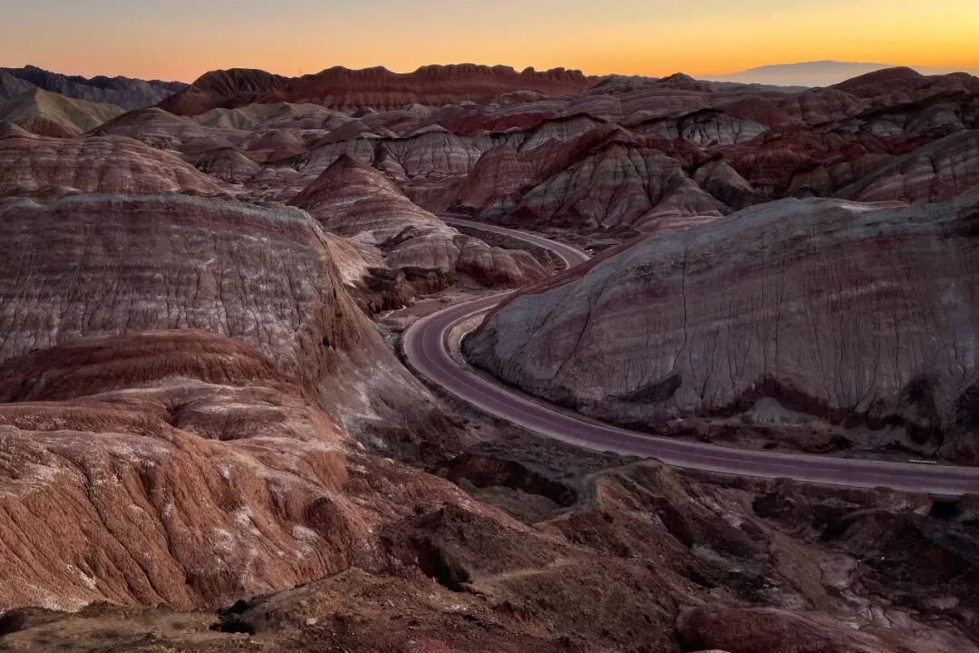 从汽车南站到张掖地质公园(七彩丹霞景区)有班车,但如果想赶到日出之前,看一眼铺满月光的丹霞,就必须包车或自驾前往。这是一个特别美好的冬季清晨,有着令人恰好能时刻感到清醒的温度,新铺的柏油公路车辆稀少,只有灯光照射到的标志线在不停后退。火热的张掖在冬季几乎没有游客,但只有在冬季,残雪能为丹霞的色彩再丰富一个层次。姜文的电影《太阳照常升起》就是冬季到张掖取的景,在电影里,这里被称作“尽头“。