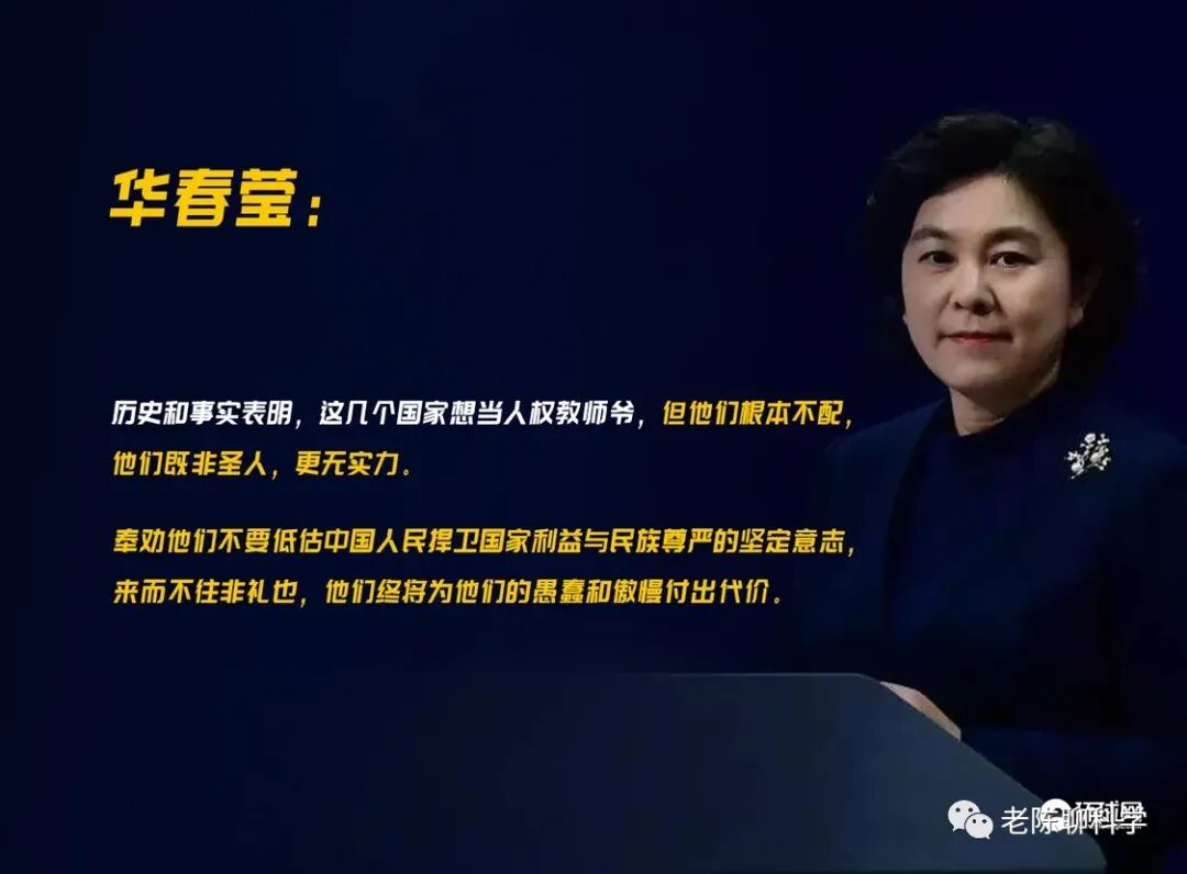 华姐说:“今天的中国,不是伊拉克,不是利比亚,不是叙利亚,更不是120年前的中国。外国列强的几门大炮就能打开中国大门的时代已经一去不复返了,几个所谓的学者和媒体同官方勾结就能肆无忌惮地抹黑攻击中国,而不受任何惩罚的日子也一去不复返了!来而不往非礼也,他们终将为他们的愚蠢和傲慢付出代价!”