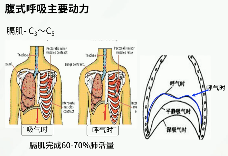 而膈肌是主要的呼吸肌,位于胸腔和腹腔之间,为向上膨隆呈穹窿形的扁薄阔肌,主要由膈神经(C3~C5)支配,膈肌收缩增加的通气量占平静呼吸时通气量的60%~70%。