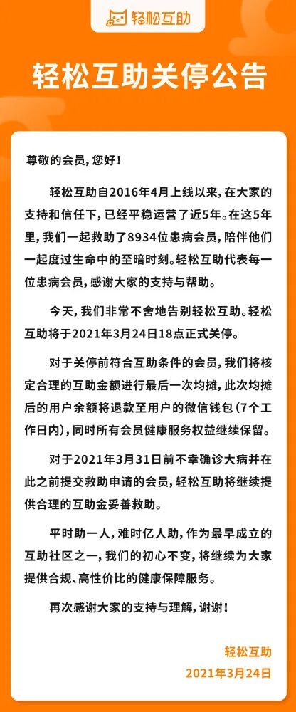 先是轻松筹旗下的轻松互助,3月24日突然宣布,对符合互助条件的会员进行最后一次分摊,随后将在当天18点关闭平台。