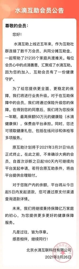 3月26日,水滴筹旗下水滴互助也走上了这一步,宣布将在3月31日18点关停,1245万付费会员为21235名患者分摊超19亿的互助金后,自己的互助也成了海市蜃楼。