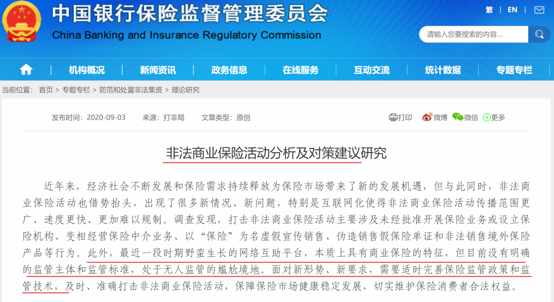 更狠的重锤还是2020年,9月银保监会明确表态,直接打中了行业的七寸:“网络互助平台,本质上具有商业保险的特征”,“会员数量庞大,属于非持牌经营,涉众风险不容忽视”,“部分前置收费模式平台形成沉淀资金,存在跑路风险”……