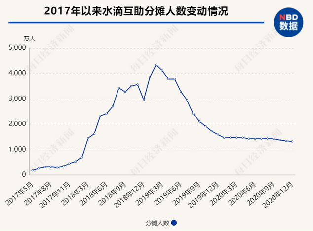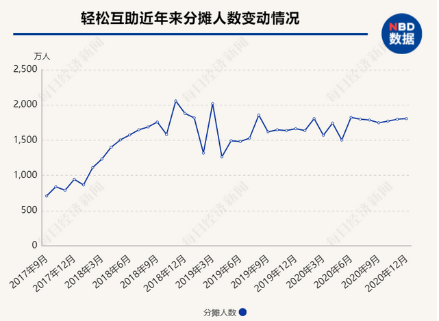 轻松互助的分摊人数,从2019年上半年巅峰时超过2000万,降到了关停前的1700万。