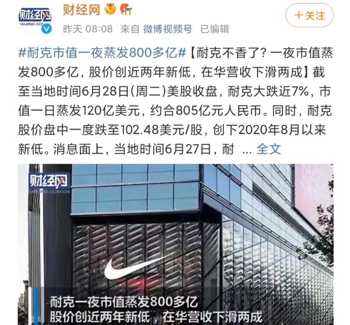 6月底,耐克公布新一季财报,最大海外市场大中华区,营收罕见大降19%,连续三个季度下滑,为近10年来最差业绩,市值一夜蒸发800亿。