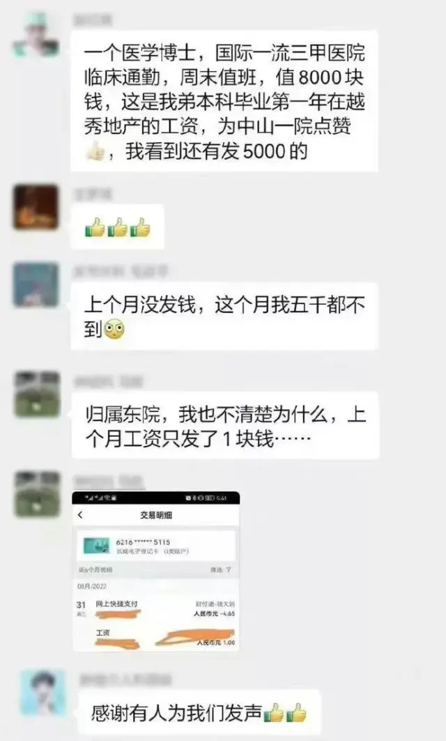 网上一名自称某国际一流的三甲医院临床医生,表示只能领到8000块的工资,群内还有其他医生称上个月没发钱,更有人自称只领到了1块钱工资,并晒出了银行截图,不过该事件真实性没有得到证实。