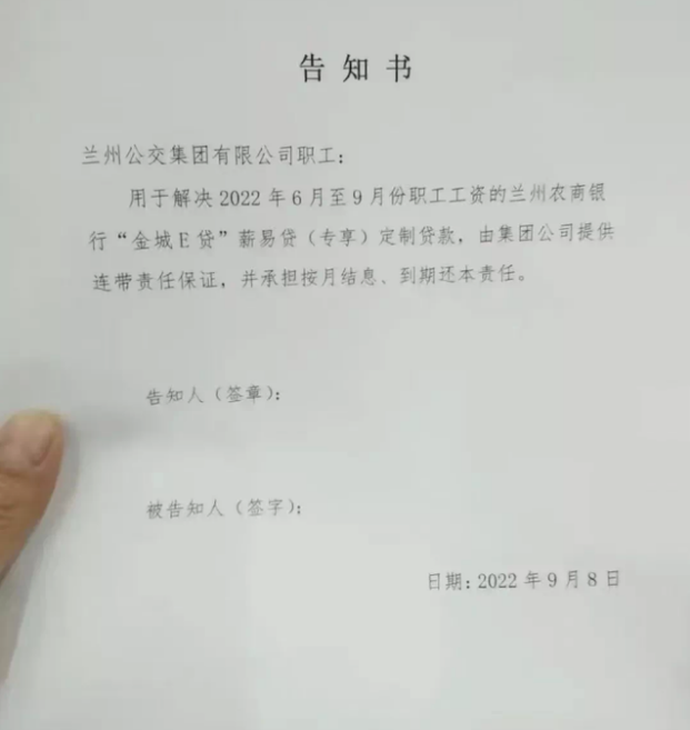 就在9月,兰州公交集团一份不同寻常的告知书被曝出,称为了解决公司6-9月的职工工资问题,要求职工向兰州农商行申请定制贷款,公交公司提供担保,并承担还本付息的责任。