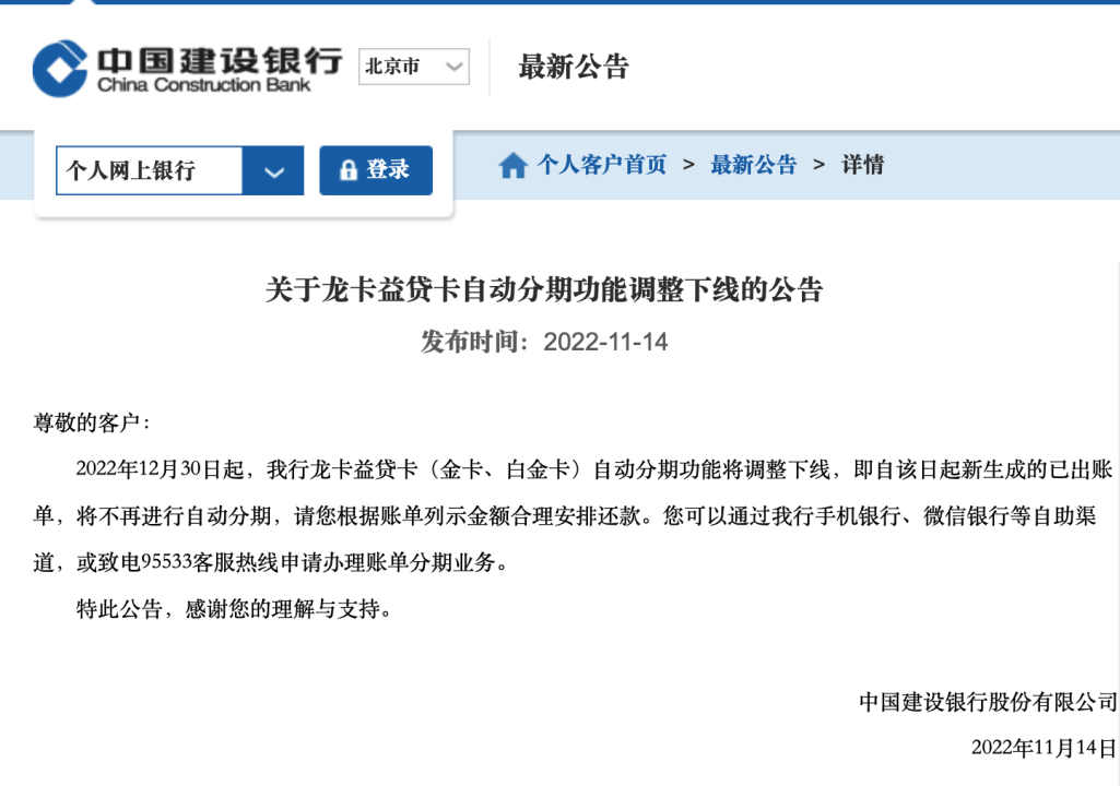 建行发布公告称,从12月30日起,建行龙卡益贷卡自动分期功能下线,之后用户的消费将不会再自动分期还款,需要分期的,可以通过其他渠道自主申请。