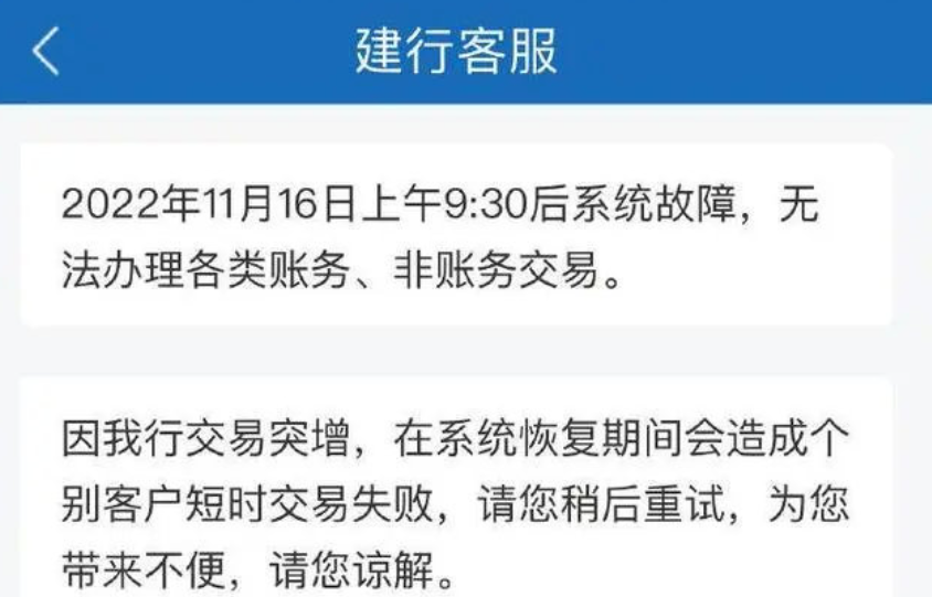11月16日,很多网友反馈建行系统崩了,无法实时转账,也不能办理各类账务交易,消息瞬间在各大社区和聊天群扩散,很多人赶紧查看自己账户,担心建行出事。