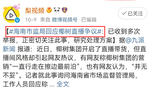 最厉害的是,第一次直播首秀,椰树发现还是被不少人举着“打擦边球”嫌疑举报,引起了海南市监部门的注意,这次直接来了个180度大转弯。