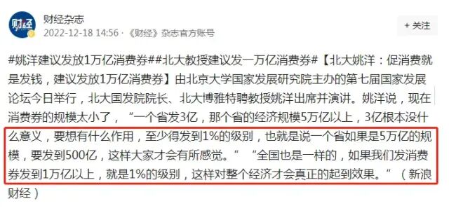 有北大教授大胆提出,“建议发放一万亿消费券”,他直言一个省发个3、5亿没有多大意义,至少得发个1%,也就是上万亿的规模,到每个人手上才有感觉,才能真正对拉动经济起作用。