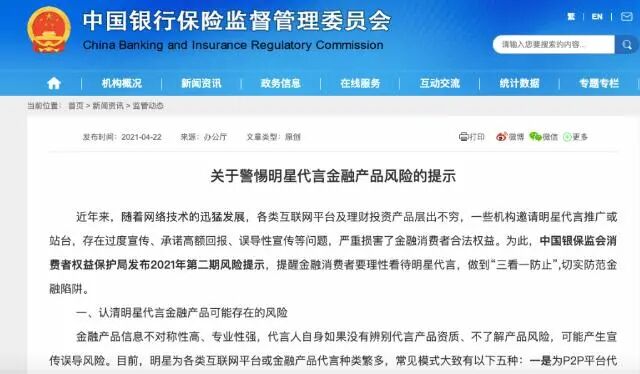 4月22日,银保监会发布风险提示,明确公众要警惕明星代言的金融产品,其中直接点名了P2P平台明星代言问题,“中晋系”和“泛亚有色”被当做特例指出。