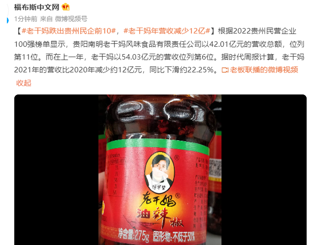 上一次被关注,还是去年10月,老干妈年收入大降12亿,2017年以来头一回跌出“2022贵州民营企业100强”前十,一夜回到四年前。