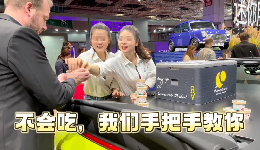 事情一点都不复杂,上海车展宝马展台免费供应价值35块钱的冰淇淋,负责分发冰淇淋的两名女孩,却公然玩起了双标。