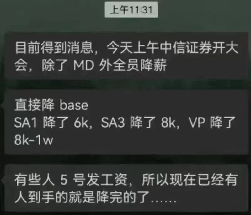 事情很快被权威媒体证实,事发的就是券商老大中信证券,整个投行业务线,除了MD(董事总经理)外全员降薪,根据职级每月固定薪酬降5000-10000,其中级经理(SA1)直降6000、副总裁(VP)降8000到10000。