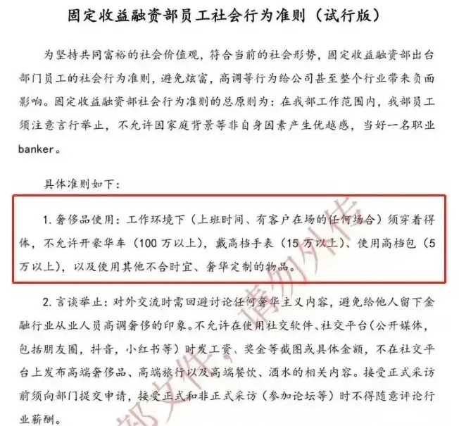 很快,一则某券商发布的员工行为准则问世,再次定义了奢侈品:不允许开豪华车(100万以上),戴高档手表(15万以上)、使用高档包(5万以上),更不允许用社交软件发工资、奖金截图。