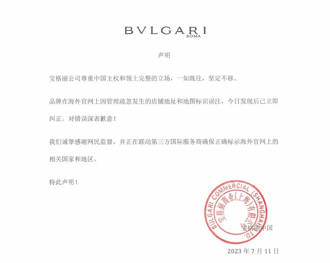 红线警报骤然拉响,宝格丽直接霸榜热搜,当天晚上才抛出一份道歉声明,聊聊几句话,都是在给自己找借口,理由是“管理疏忽”、“第三方地图标识错误”,已经改正,仅此而已。