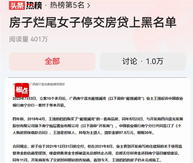 广西南宁“烂尾楼女子停贷上黑名单”一事,触动了无数人,因为每个房奴在没收到房之前,都有可能沦落到同样的下场。
